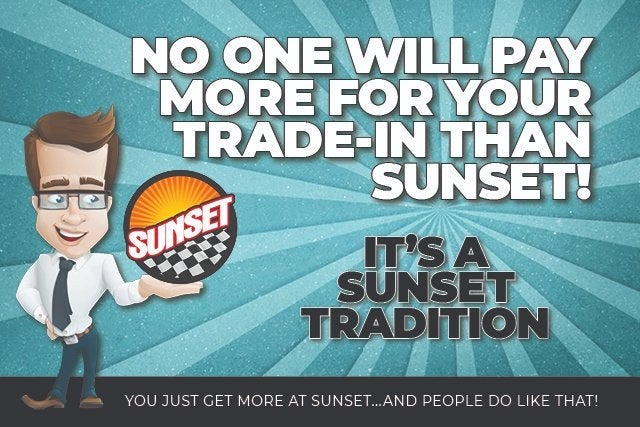 Disclaimer “MSRP” is an acronym for Manufacturer’s Suggested Retail Price. This is required for all manufacturers to provide. MSRP is not an offer to sell at that price. It is the “Manufacturer’s Suggested Retail Price” before extras. “MSRP” will be exactly the same for any new vehicle with the exact same make, model, model year, equipment, and options at every franchise dealership in the United States. No dealer has a competitive advantage over another with MSRP. ‘Dealership price’ or ‘sale price’, when shown, reflects the sale price of the vehicle, including all applicable rebates and discounts unless expressly shown differently. Accessories & dealer-installed modifications are included in the “Dealership Price”. ‘Dealership price’ or ‘sale price’ does not include tax, title, government fees, a negotiable $200 document processing fee, license, vehicle registration or any financing fees. Contact us for details on any applicable fees or taxes that may apply to your specific situation. Sunset will always provide you with a clear and transparent summary of the final sale price and all applicable fees and taxes. All vehicles are “one only” and are identified by VIN and/or stock number. Some manufacturer discounts, rebates, incentives, and special financing cannot be combined or stacked. Not all customers qualify for all available manufacturer discounts, rebates, incentives, and special financing. Contact the dealership to verify which manufacturer discounts, rebates, incentives, and special financing you qualify for. Sunset will work to ensure that you will receive all applicable manufacturer incentives. All prices, specifications, and availability subject to change without notice. Contact dealer for most current information. While we make every reasonable effort to ensure the accuracy of the information displayed on this website, some prices may not include dealer installed added options, some features and options listed may not apply to this Sunset Vehicle. Please verify any information in question with a dealership sales representative prior to any negotiations. Customers should verify the existence and condition of any equipment listed. EPA Estimates Only. Your actual MPG may vary based on your driving characteristics. All offers expire on close of business the day subject content is removed from website, and all financing is subject to credit approval. All transactions are negotiable including price, trade allowance, interest rate (of which the dealer may retain a portion), term, and documentary service fee. Any agreement is subject to execution of contract documents. Warranty Protection for Life™ is included on all qualifying new and pre-owned vehicles. Some restrictions may apply. Contact the dealership for details on your vehicle of interest. This warranty is honored at any ASE certified repair facility in The United States and Canada. Note: There is now a modest $200 deducible per claim. Manufacturer maintenance requirements and records are mandatory. Contact dealer for complete details. There are some vehicles that are not eligible for this coverage. A complete list of ineligible vehicles is available upon request. Warranty Protection for Life is not included on vehicles purchased by a business entity or used for Commercial & Fleet purposes. Owners are responsible for maintaining their vehicle according to the original manufacturer’s recommendations. Failure to do so or keep records may void your warranty. Aftermarket vehicle modifications may void your warranty. Contact dealer or review your warranty agreement for details on maintaining this coverage. Sunset’s Oil Changes for Life is included on all qualifying new and pre-owned vehicles. Some restrictions may apply. Contact the dealership for details on your vehicle of interest. See dealer for complete details. There are some vehicles that are not eligible for this coverage. A complete list of ineligible vehicles is available upon request. Verify prior to purchase if a vehicle comes with either Warranty Protection for Life or Oil Changes for Life. Although every reasonable effort has been made to ensure the accuracy of the information contained on this site, absolute accuracy cannot be guaranteed. This site, and all information and materials appearing on it, are presented to the user "as is" without warranty of any kind, either express or implied. All vehicles are subject to prior sale. Price does not include applicable tax, title, and license charges. ‡Vehicles shown at different locations are not currently in our inventory (Not in Stock) but can be made available to you at our location within a reasonable date from the time of your request, not to exceed one week. If you have any questions about or would like clarification on any information found on this website, please contact us. The Manufacturer’s Suggested Retail Price excludes tax, title, license, dealer fees and optional equipment. Dealer sets final price.